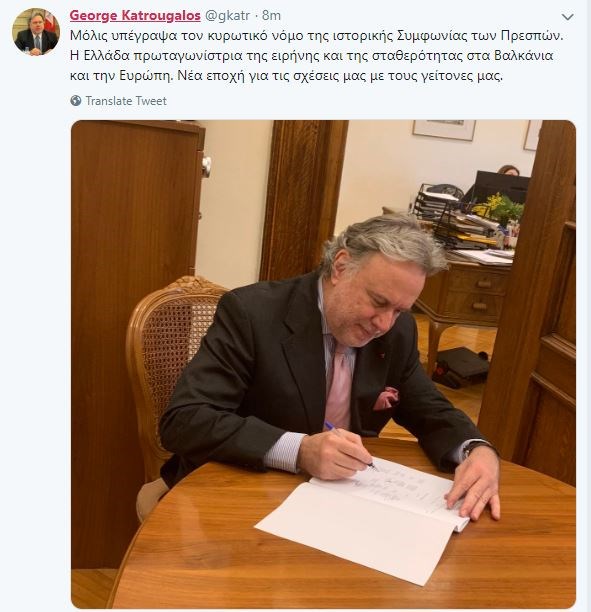Μία φωτογραφία από τη στιγμή της υπογραφής του στον κυρωτικό νόμο της ιστορικής Συμφωνίας των Πρεσπών ανήρτησε στον λογαριασμό του στο Twitter ο αναπληρωτής υπουργός Εξωτερικών, Γιώργος Κατρούγκαλος.«Μόλις υπέγραψα τον κυρωτικό νόμο της ιστορικής Συμφωνίας των Πρεσπών», αναφέρει στην ανάρτησή του ο κ. Κατρούγκαλος και συμπληρώνει: «Η Ελλάδα πρωταγωνίστρια της ειρήνης και της σταθερότητας στα Βαλκάνια και την Ευρώπη. Νέα εποχή για τις σχέσεις μας με τους γείτονες μας».Δείτε τo tweet: