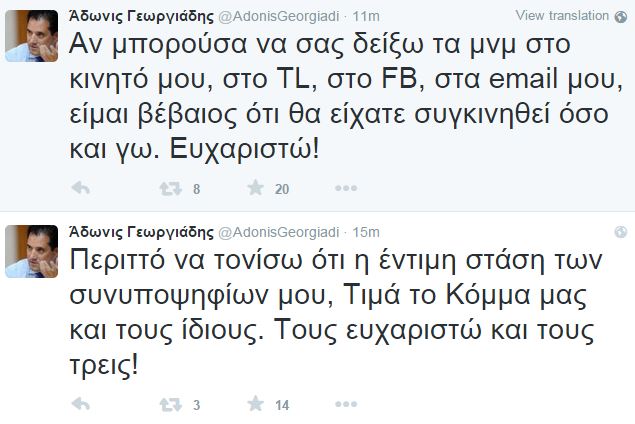 «Αν μπορούσα να σας δείξω τα μνμ στο κινητό μου, στο TL, στο FB, στα email μου, είμαι βέβαιος ότι θα είχατε συγκινηθεί όσο και γω. Ευχαριστώ!», γράφει χαρακτηριστικά σε ένα tweet, ενώ σε ένα ακόμα τονίζει: