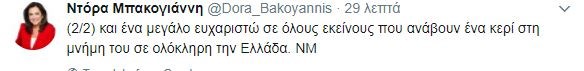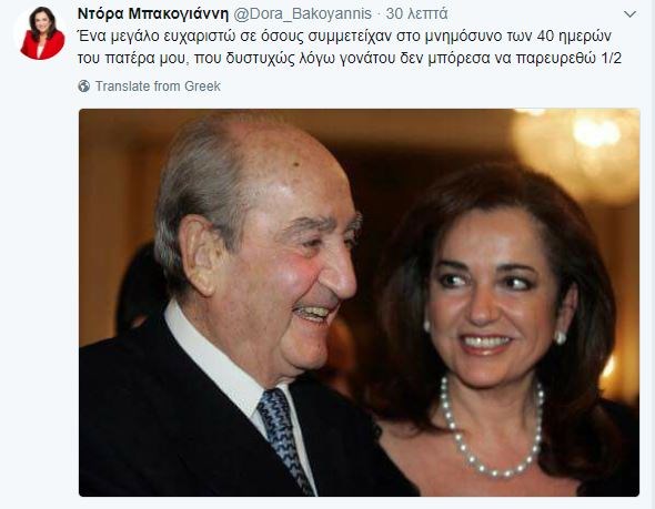 “Ένα μεγάλο ευχαριστώ σε όσους συμμετείχαν στο μνημόσυνο των 40 ημερών του πατέρα μου, που δυστυχώς λόγω γονάτου δεν μπόρεσα να παρευρεθώ και ένα μεγάλο ευχαριστώ σε όλους εκείνους που ανάβουν ένα κερί στη μνήμη του σε ολόκληρη την Ελλάδα” έγραψε η Ντόρα Μπακογιάννη.