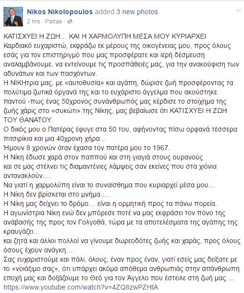 «Κατισχύει η ζωή και η χαρμολύπη μέσα μου κυριαρχεί» γράφει ο κ. Νικολόπουλος ενώ παράλληλα στέλνει μήνυμα για τη δωρεά οργάνων.