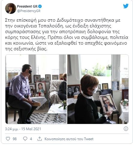 Στο σπίτι της οικογένειας Τοπαλούδη βρέθηκε η Πρόεδρος της Δημοκρατίας, που πραγματοποιεί περιοδεία στη Θράκη. Η Κατερίνα Σακελλαροπούλου που βρίσκεται στο Διδυμότειχο, επισκέφτηκε τους γονείς της Ελένης Τοπαλούδη έναν χρόνο μετά την καταδικαστική σε βάρος των δολοφόνων και βασανιστών της απόφαση.