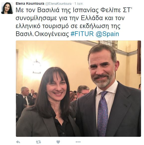 Σύντομη συνάντηση με τον βασιλιά της Ισπανίας, Φελίπε ΣΤ΄, στο Παλάτι Πάρδο, είχε η υπουργός Τουρισμού, Έλενα Κουντουρά, που εκπροσωπεί την Ελλάδα στην Διεθνή Έκθεση Τουρισμού FITUR, στη Μαδρίτη, όπου ο Ελληνικός Οργανισμός Τουρισμού συμμετέχει με περίπτερο, με στόχο την ενίσχυση του τουριστικού ρεύματος από την Ισπανία προς την Ελλάδα, το 2017.