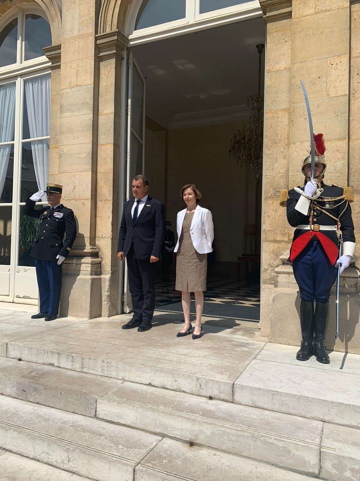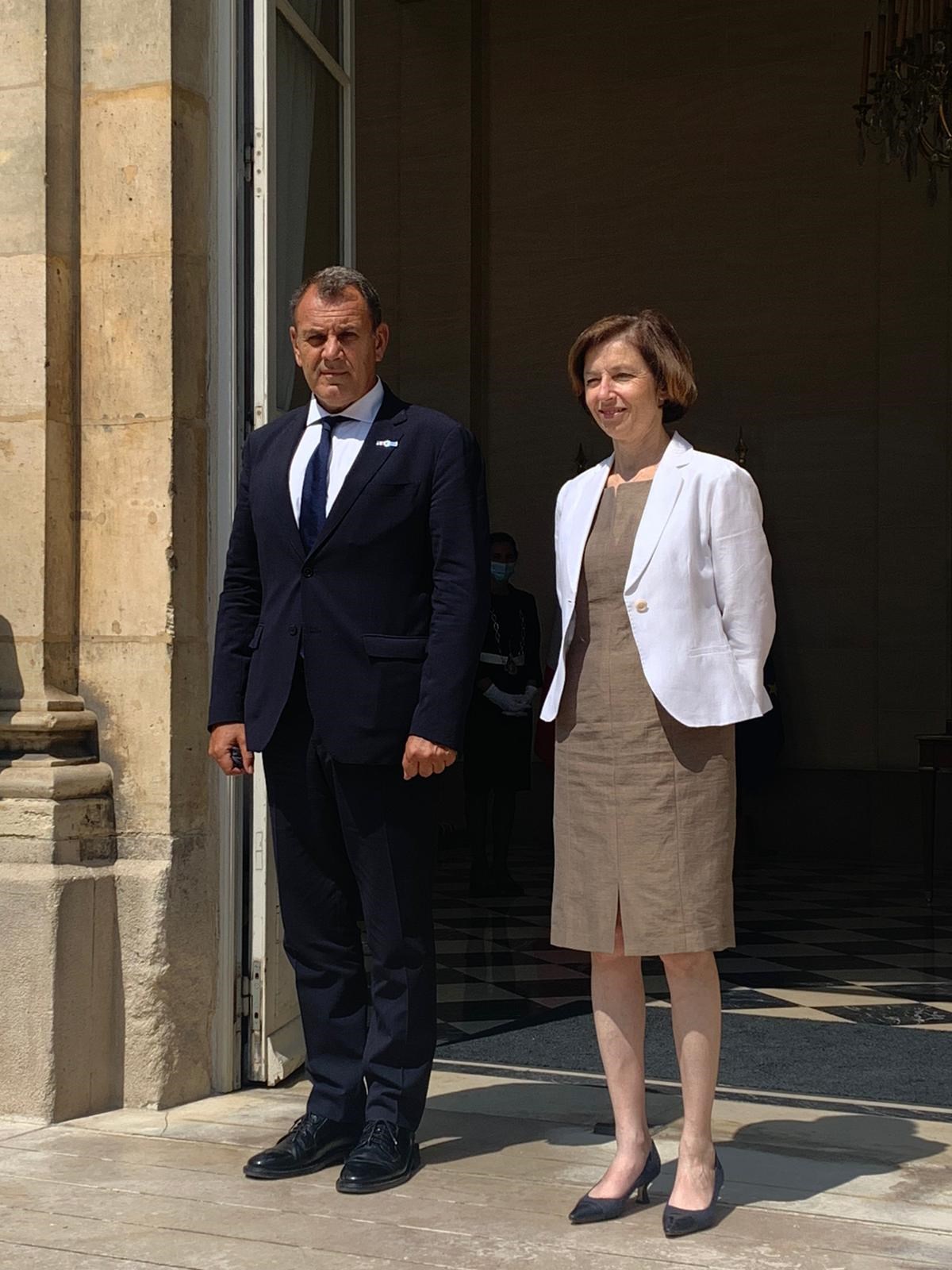 Λίγες ώρες αργότερα πέταξε για το Παρίσι, εκεί όπου είχε συνάντηση με την Γαλλίδα ομόλογό του Φλοράνς Παρλί. Κατά τη συνάντηση συζητήθηκαν θέματα περαιτέρω ενισχύσεως της διμερούς αμυντικής συνεργασίας και υπογραμμίστηκε η σημασία της σημερινής παραδόσεως του πρώτου μαχητικού αεροσκάφους “Rafale” στην Ελληνική Πολεμική Αεροπορία, η οποία αντανακλά την Στρατηγική σχέση Ελλάδος – Γαλλίας και τους ισχυρούς διαχρονικούς δεσμούς φιλίας, συνεργασίας και αλληλεγγύης των δύο χωρών και των λαών τους.