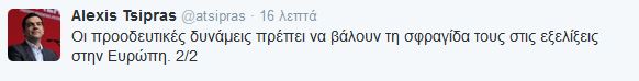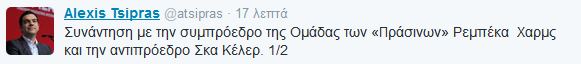 «Οι προοδευτικές δυνάμεις πρέπει να βάλουν τη σφραγίδα τους στις εξελίξεις στην Ευρώπη», έγραψε στο Twitter ο Έλληνας Πρωθυπουργός και ανέβασε τη φωτογραφία από τη συνάντησή του με την Ρεμπέκα Χαρμς και την Σκα Κέλερ.