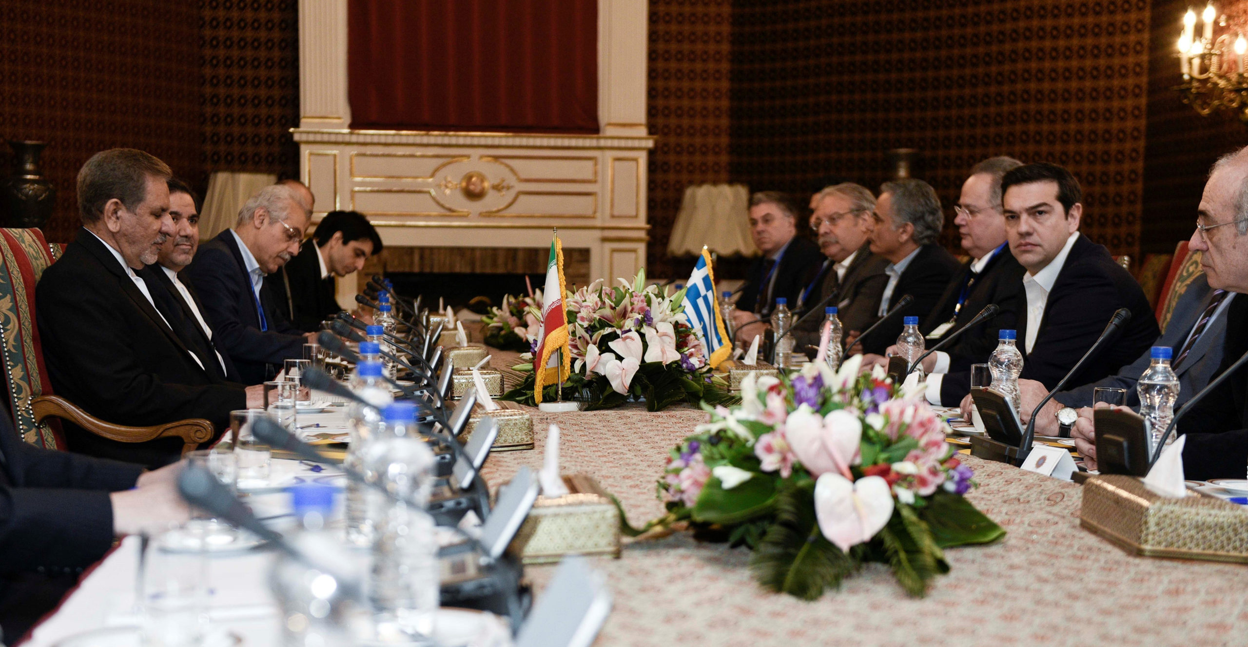 Νωρίτερα, ο Πρωθυπουργός, κατά την επίσκεψη του στην Τεχεράνη, πλαισιωμένος από την ελληνική αντιπροσωπεία συνομίλησε με την Ιρανική αντιπροσωπεία.
