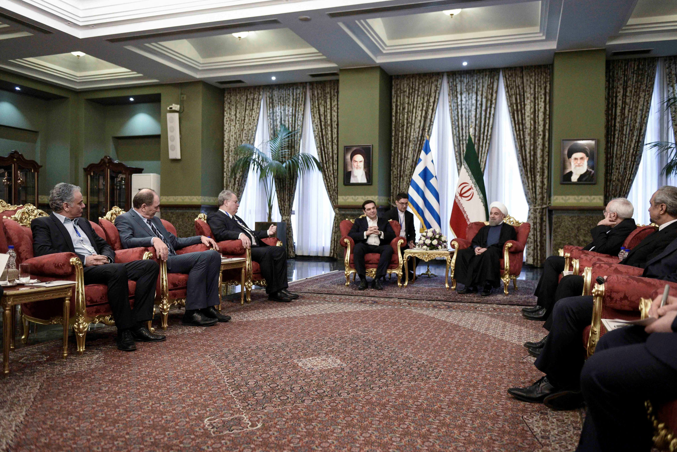 Συνάντηση με τον Πρόεδρο του Ιράν Χασάν Ρουχανί είχε ο Έλληνας Πρωθυπουργός, Αλέξης Τσίπρας, στο πλαίσιο της διήμερης επίσημης επίσκεψης του στο Ιράν. Όπως φαίνεται και στις φωτογραφίες, τον Αλέξη Τσίπρα, συνοδεύουν ο Πάνος Σκουρλέτης, ο Γιώργος Σταθάκης και ο Νίκος Κοτζιάς.