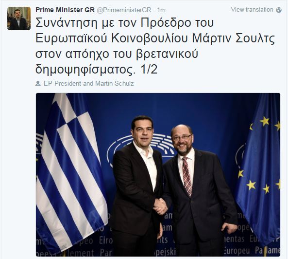 «Συνάντηση με τον Πρόεδρο του Ευρωπαϊκού Κοινοβουλίου Μάρτιν Σουλτς στον απόηχο του βρετανικού δημοψηφίσματος» έγραψε ο Έλληνας Πρωθυπουργός και ανέβασε τη φωτογραφία με τον Μάρτιν Σουλτς.