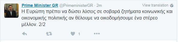 Ο Αλέξης Τσίπρας με δεύτερη ανάρτηση στο Twitter πρόσθεσε: «η Ευρώπη πρέπει να δώσει λύσεις σε σοβαρά ζητήματα κοινωνικής και οικονομικής πολιτικής αν θέλουμε να οικοδομήσουμε ένα στέρεο μέλλον».