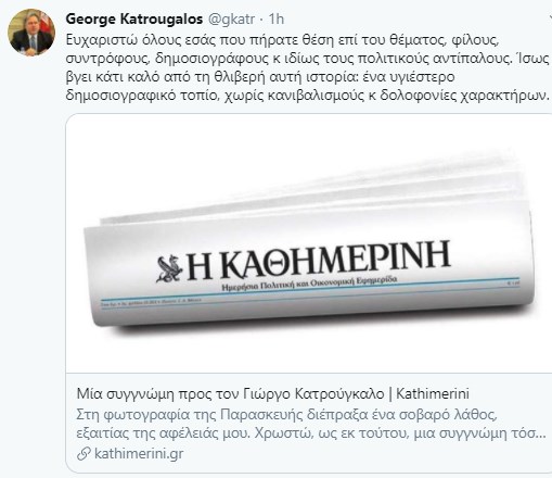 “Η «Κ» ζητά συγγνώμη από τον κ. Γιώργο Κατρούγκαλο για τη φωτογραφία και το σχόλιο που τη συνόδευε στο σημερινό φύλλο της εφημερίδας. Όσο και αν είναι προφανές ότι ο αρθρογράφος δεν γνώριζε την περιπέτεια υγείας του κ. Κατρούγκαλου, σημασία έχει ότι πρόκειται για ατόπημα. Το οποίο δεν θα επαναληφθεί” σημείωσε από την πλευρά της η εφημερίδα “Καθημερινή”.