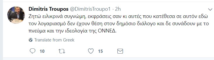“Ζητώ ειλικρινά συγνώμη, εκφράσεις σαν κι αυτές που κατέθεσα σε αυτόν εδώ τον λογαριασμό δεν έχουν θέση στον δημόσιο διάλογο και δε συνάδουν με το πνεύμα και την ιδεολογία της ΟΝΝΕΔ” αναφέρει ο Δημήτρης Τρούπος, σε tweet του.