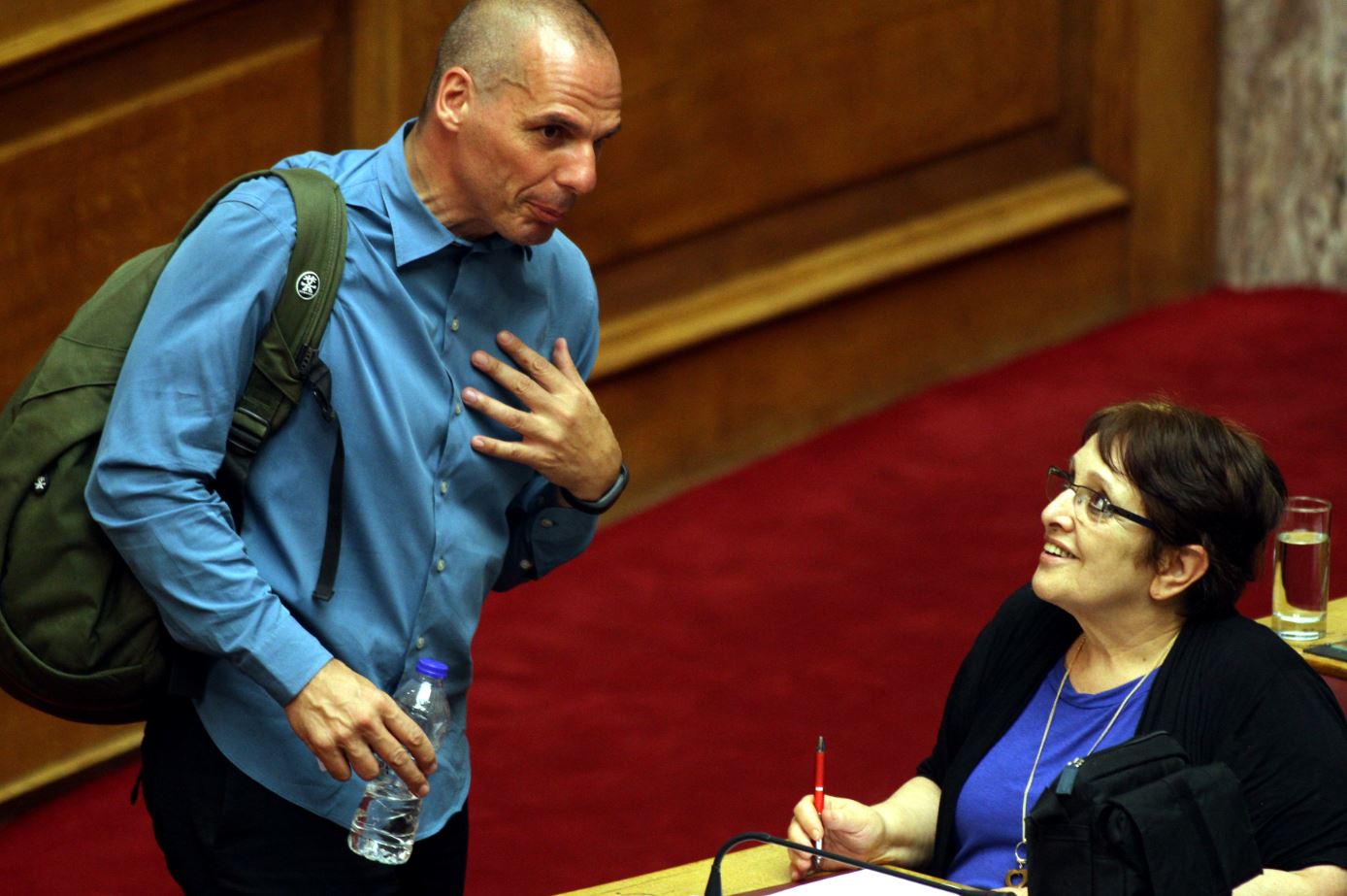 Σύντομη συνομιλία με την βουλευτή του ΚΚΕ, Αλέκα Παπαρήγα, είχε ο πρώην υπουργός Οικονομικών, Γιάνης Βαρουφάκης, κατά τη διάρκεια της συζήτησης του νομοσχεδίου με τα προαπαιτούμενα μέτρα της Συμφωνίας της Συνόδου Κορυφής. Όπως φαίνεται και στη φωτογραφία, κατά τη διάρκεια της συνομιλίας τους δεν έλειψαν και τα χαμόγελα.