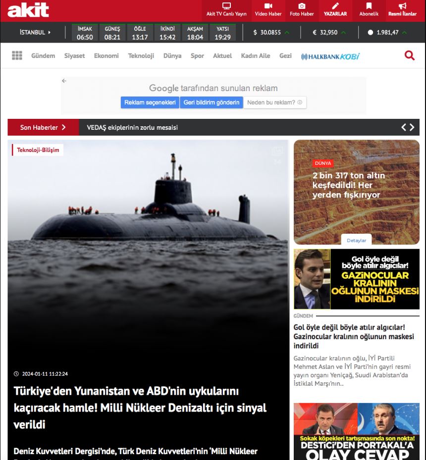 Πρόσφατα, στις 10 Ιανουαρίου, κι ενώ οι Ελληνικές Ένοπλες Δυνάμεις είχαν στραμμένο το βλέμμα τους στις Κρίσεις του Αρχηγού ΓΕΕΘΑ και των Αρχηγών των Επιτελείων, ο Τούρκος αντιπλοίαρχος του Πολεμικού Ναυτικού, Deniz Aytan, υποστήριζε σε άρθρο στο “Deniz Kuvvetleri Dergisi”, το περιοδικό του τουρκικού πολεμικού ναυτικού, ότι μετά την κατασκευή του πυρηνικού εργοστασίου στο Άκουγιου η τουρκική αμυντική βιομηχανία μπορεί να προχωρήσει στην ανάπτυξη και κατασκευή του πρώτου της πυρηνικού υποβρυχίου.