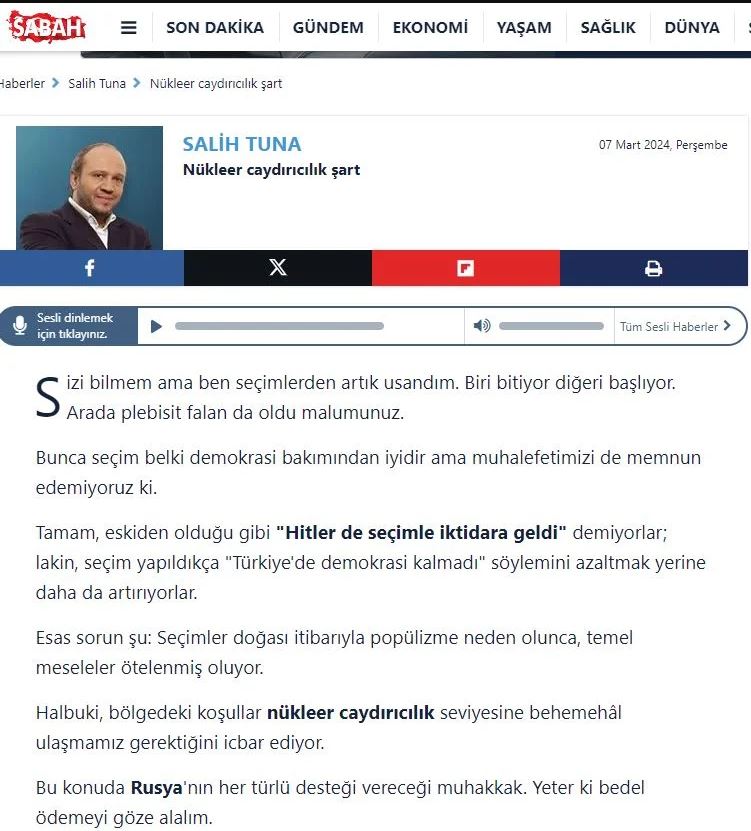 Πίσω, όμως, από τα όμορφα λόγια περί «πράσινης ενέργειας» που θα φέρει η ενεργοποίηση των πυρηνικών αντιδραστήρων κρύβονται τα όνειρα της Τουρκίας για την απόκτηση πυρηνικών όπλων. Είναι κάτι που… ξέφυγε πριν από 3 μήνες στην εφημερίδα SABAH, με ένα άκρως επιθετικό άρθρο απέναντι στην Ελλάδα και το Ισραήλ, που το υπέγραφε ο Salih Tuna.