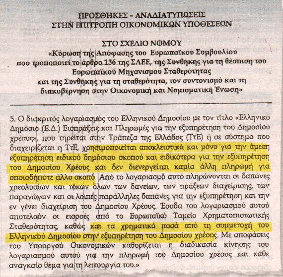 Τη συγκρότηση του ειδικού λογαριασμού στην Τράπεζα της Ελλάδος που χρησιμοποιείται αποκλειστικά και μόνο για την άμεση εξυπηρέτηση του Δημόσιου χρέους κάνει πρωτοσέλιδο η εφημερίδα Αυγή.Όπως γράφει η εφημερίδα, ΠΑΣΟΚ και ΝΔ πέρασαν στα μουλωχτά τροπολογία για την κατά προτεραιότητα εξόφληση των δανειστών και πληρωμή μισθών και συντάξεων απ’ όσα περισσέψουν και τονίζει ότι αυτή η πρακτική παραπέμπει στα Δάνεια του Αγώνα του 1825 με την εισβολή του Ιμπραήμ και το περιβόητο «Σύμφωνο της πωληθείσης Ελλάδος». Οι σύγχρονοι πιστωτές συγκροτούν τον περίφημο ειδικό λογαριασμό στον οποίο θα κατατίθενται απευθείας τα χρήματα του δανείου καθώς επίσης και τα έσοδα του κράτους από φόρους και αποκρατικοποιήσεις.