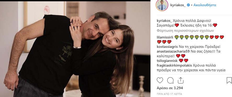 «Χρόνια πολλά Δαφνού! Σαγαπάμε!❤️ Έκλεισες ήδη τα 16!❤», έγραψε ο Κυριάκος Μητσοτάκης.