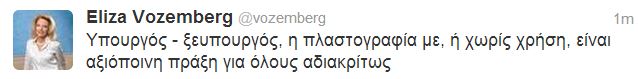 Τη σύλληψη του πρώην υπουργού Μεταφορών, Μιχάλη Λιάπη σχολίασε στο twitter η γραμματέας πολιτικού σχεδιασμού της Νέας Δημοκρατίας, Ελίζα Βόζεμπεργκ.