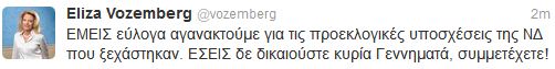 Η πρώην βουλευτής της Νέας Δημοκρατίας Ελίζα Βόζεμπεργκ μέσω του twitter ζητά από την εκπρόσωπο τύπου Φώφη Γεννηματά να μην «αγανακτεί» με τις υποσχέσεις του πρωθυπουργού Αντώνη Σαμαρά πριν τις εκλογές, που «ξεχαστήκαν», καθώς το κόμμα της συμμετέχει στη συγκυβέρνηση. Διαβάστε την ανάρτηση της κ. Βόζεμπεργκ.