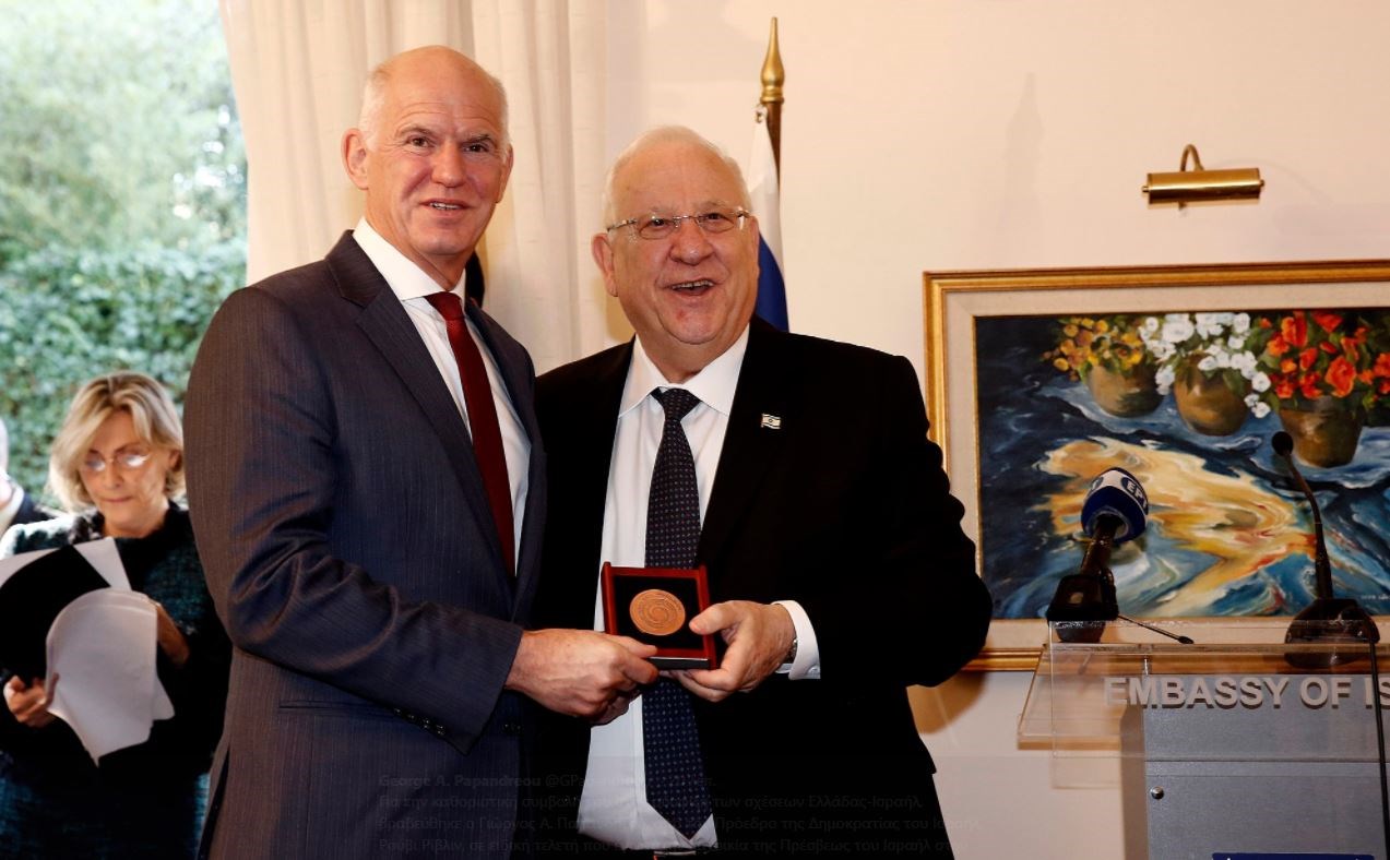Για την καθοριστική συμβολή του στην σύσφιξη των σχέσεων Ελλάδας-Ισραήλ, βραβεύθηκε ο Γιώργος Α. Παπανδρέου, από τον Πρόεδρο της Δημοκρατίας του Ισραήλ, Ρούβι Ρίβλιν, σε ειδική τελετή που έγινε στην κατοικία της Πρέσβεως του Ισραήλ στην Ελλάδα, Ιρίτ Μπεν Άμπα.