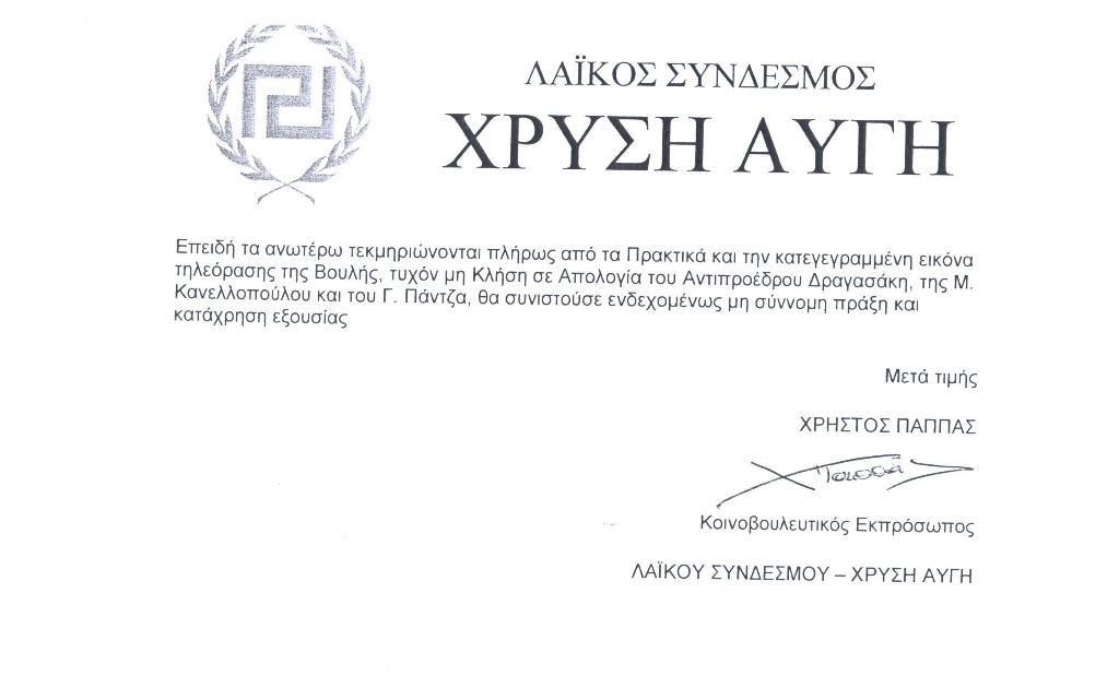 Η Χρυσή Αυγή, τηρώντας το Σύνταγμα, τους νόμους του κράτους και τον κανονισμό της Βουλής και με αίσθημα ευθύνης έναντι του Ελληνικού Λαού καλεί τον πρόεδρο του ελληνικού Κοινοβούλιο με αναφορά που κατέθεσε σήμερα να πάρει θέση για αυτήν τη θλιβερή, αντισυνταγματική και παράνομη συμπεριφορά του αντιπροέδρου της Βουλής Δραγασάκη και των βουλευτών του ΣΥΡΙΖΑ, καλώντας τον να εφαρμόσει τα προβλεπόμενα από τον κανονισμό. Οιαδήποτε αδράνεια και συγκάλυψη της παράνομης συμπεριφοράς Δραγασάκη θα είναι ακόμα μία αποκάλυψη εκ μέρους των κυβερνώντων για το τι εννοούν όταν λένε “Συνταγματικό τόξο”. Κάθε μέρα που περνάει αποκαλύπτονται στα μάτια του Ελληνικού Λαού”.