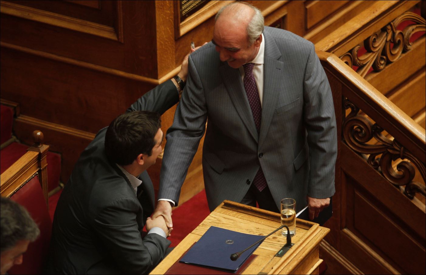 Ο φωτογραφικός φακός απαθανάτισε τους Αλέξη Τσίπρα και Βαγγέλη Μεϊμαράκη να ανταλλάσσουν θερμή χειραψία κατά τη διάρκεια της συζήτησης στη Βουλή του νομοσχεδίου για την εξουσιοδότηση της κυβέρνησης για την «Διαπραγμάτευση και Σύναψη Δανειακής Σύμβασης με τον Ευρωπαϊκό Μηχανισμό Σταθερότητας (ESM)».