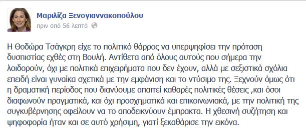 «Η Θοδώρα Τσάγκρη είχε το πολιτικό θάρρος να υπερψηφίσει την πρόταση δυσπιστίας εχθές στη Βουλή» γράφει στο προσωπικό της προφίλ στο facebook η Μαριλίζα Ξενογιαννακοπούλου και συνεχίζει: