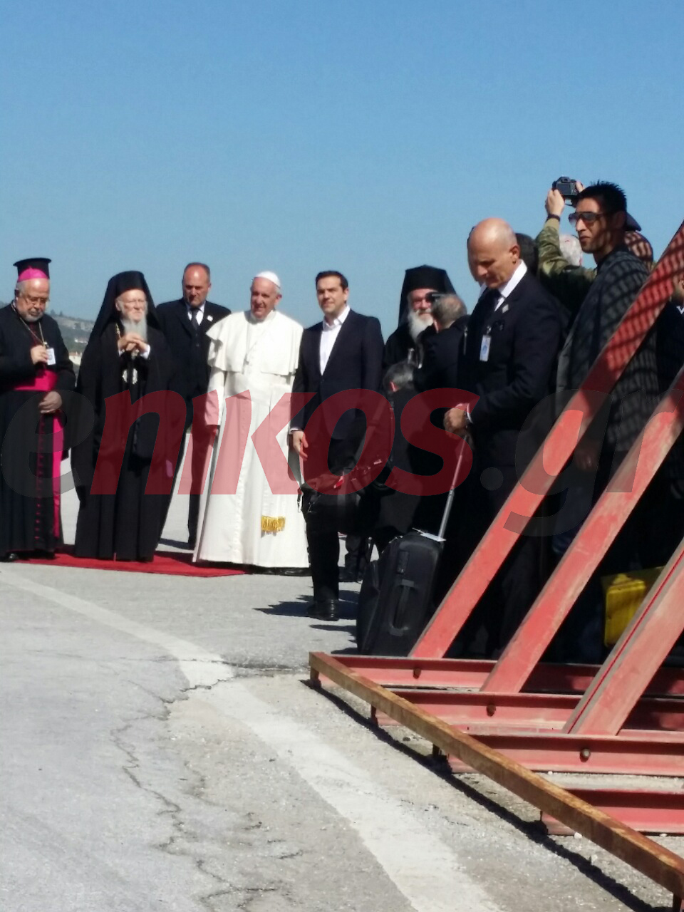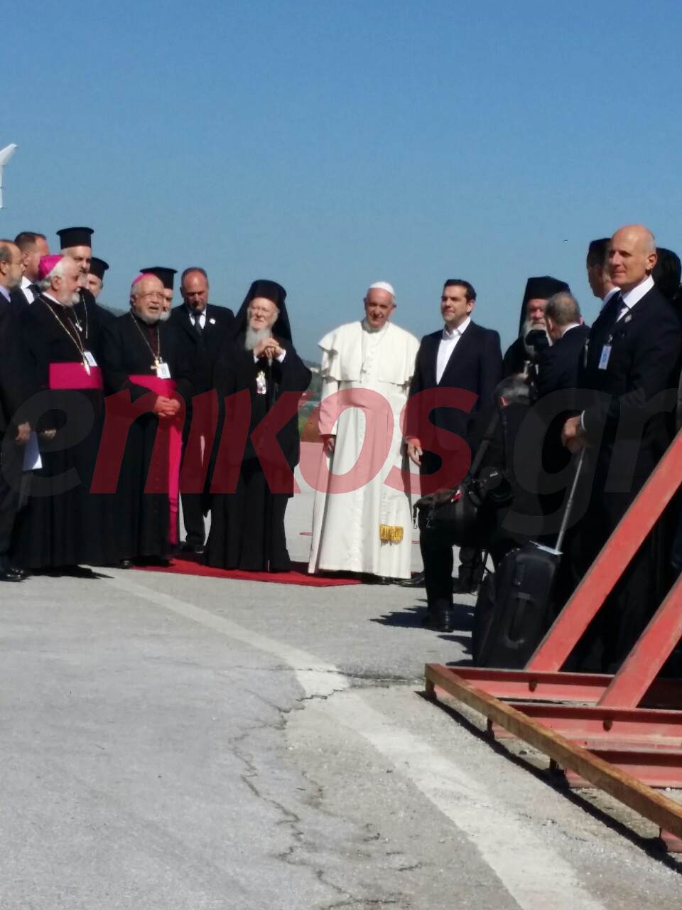 Ο πρωθυπουργός Αλέξης Τσίπρας υποδέχθηκε στο αεροδρόμιο της Μυτιλήνης τον Πάπα Φραγκίσκο, μαζί με τον Οικουμενικό Πατριάρχη Βαρθολομαίο, τον Αρχιεπίσκοπο Ιερώνυμο και τον πρόεδρο της Καθολικής Ιεραρχίας Ελλάδος Φραγκίσκο Παπαμανώλη.