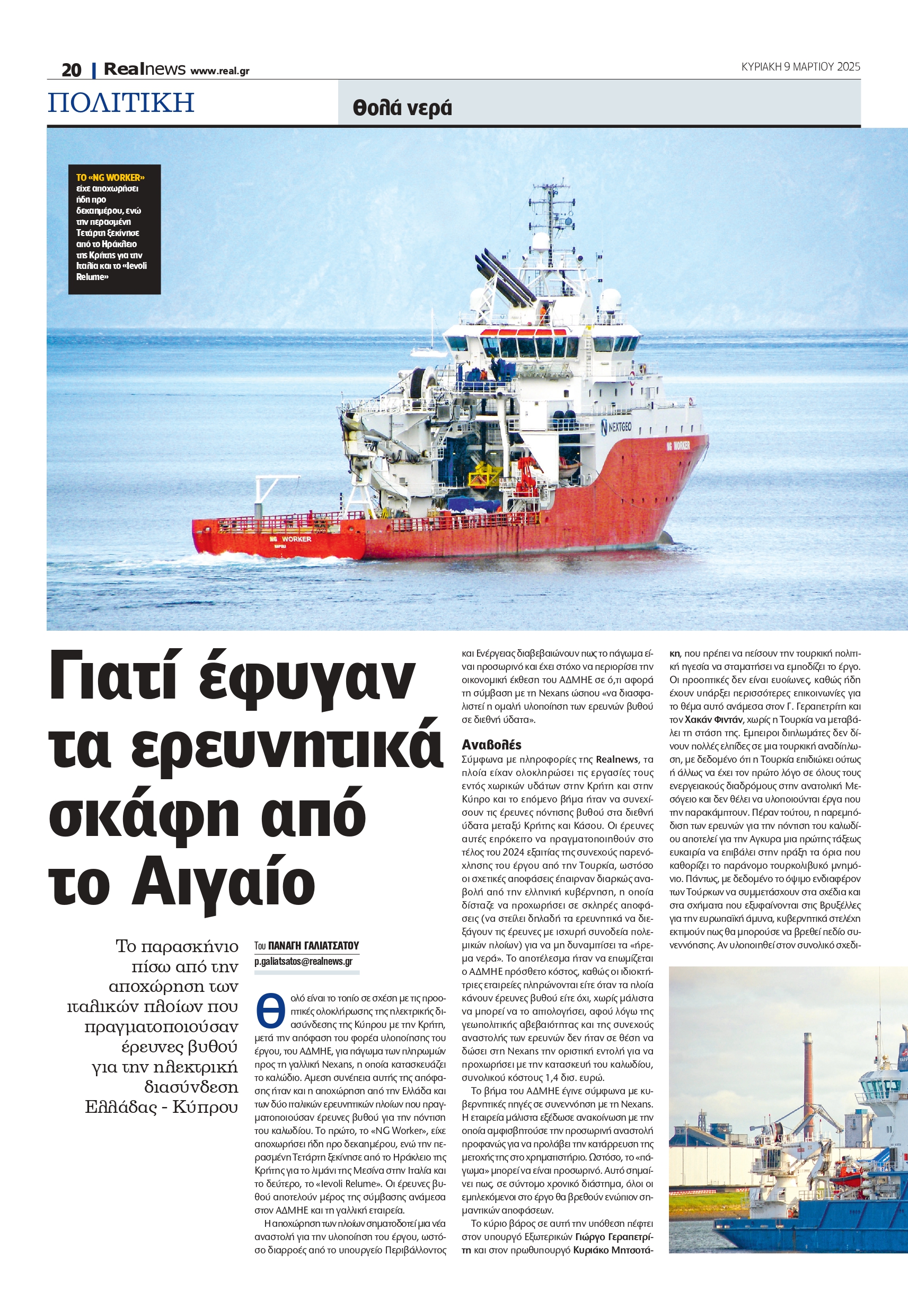 Σύμφωνα με πληροφορίες της Realnews, τα πλοία είχαν ολοκληρώσει τις εργασίες τους εντός χωρικών υδάτων στην Κρήτη και στην Κύπρο και το επόμενο βήμα ήταν να συνεχίσουν τις έρευνες πόντισης βυθού στα διεθνή ύδατα μεταξύ Κρήτης και Κάσου.