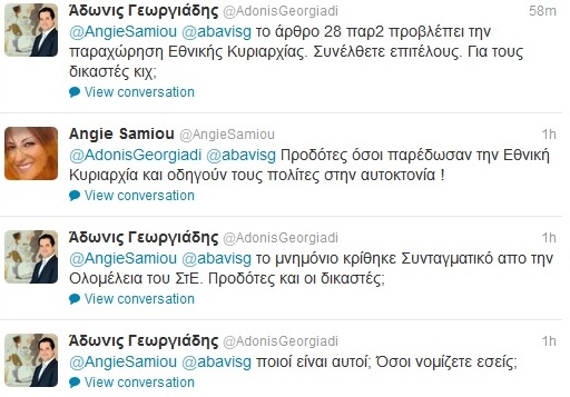 Φωτιά πήρε το Twιtter από τα εκατέρωθεν λεκτικά πυρά που αντάλλαξε ο Άδωνις Γεωργιάδης και η Άντζυ Σαμίου! Ο βουλευτής της ΝΔ έγραψε στον προσωπικό του λογαριασμό ότι συμφωνεί με την επιστολή Κρεμαστινού. «Οφείλω δημοσίως να εκφράσω την κατά το 100% συμφωνία μου με την επιστολή του κ. Κρεμαστινού στον Πρόεδρο της Βουλής».Δήλωση που εξόργισε την λαϊκή τραγουδίστρια η οποία απάντησε: «Προδότες όσοι παρέδωσαν την Εθνική Κυριαρχία και οδηγούν τους πολίτες στην αυτοκτονία!».Η ανταλλαγή μηνυμάτων μεταξύ τους συνεχίστηκε με αμείωτο ρυθμό….