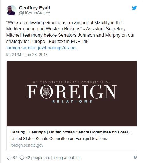 “Οι ΗΠΑ δημιουργούν μια μακροπρόθεσμη στρατηγική για την ενίσχυση της παρουσίας των ΗΠΑ στην Ανατολική Μεσόγειο και αντιμετωπίζουν την Ελλάδα ως πυλώνα σταθερότητας στη Μεσόγειο και στα Δυτικά Βαλκάνια” υπογράμμισε σε κατάθεση του στην Επιτροπή Εξωτερικών Υποθέσεων της Γερουσίας ο αναπληρωτής υφυπουργός Εξωτερικών αρμόδιος για την Ευρώπη, Γουές Μίτσελ. Ο Αμερικανός αξιωματούχος επιφύλαξε θερμότατους χαρακτηρισμούς για Τσίπρα-Ζάεφ τους οποίους αποκάλεσε “οραματιστές ηγέτες”.