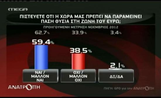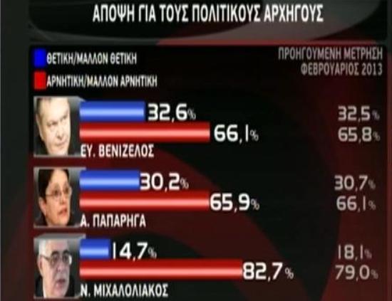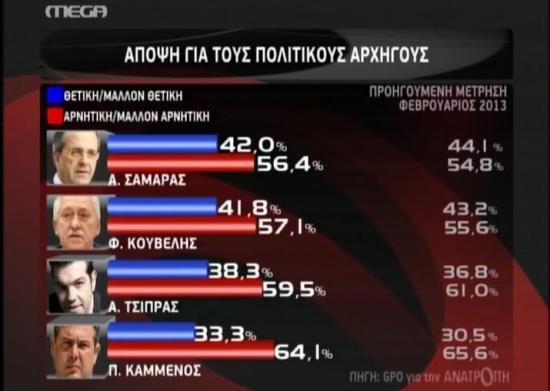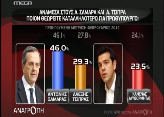 Στην ερώτηση «ανάμεσα στους Αντώνη Σαμαρά και Αλέξη Τσίπρα ποιον θεωρείτε καταλληλότερο για πρωθυπουργό;», τον Αντώνη Σαμαρά επιλέγει το 46% των ερωτηθέντων, έναντι 29,3% που επιλέγει τον Αλέξη Τσίπρα. Κανέναν από τους δύο απαντάει το 23,5% των ερωτηθέντων.