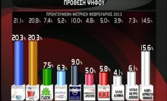 Ειδικότερα, στην πρόθεση ψήφου η ΝΔ και ο ΣΥΡΙΖΑ συγκεντρώνουν από 20,3%. Ακολουθούν η Χρυσή Αυγή με 9%, το ΠΑΣΟΚ με 7,5%, οι Ανεξάρτητοι Έλληνες με 6,3%, το ΚΚΕ με 5,8% και η ΔΗΜΑΡ με 5%. Ένα ποσοστό 4,1% απάντησε άλλο κόμμα. Αποχή / Λευκό / Άκυρο απάντησε το 6,1%, ενώ αδιευκρίνιστη είναι η ψήφος του 15,6% των ερωτηθέντων.