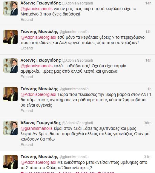 «Απόλαυσε τα καλύτερα που λες όσο είναι ακόμα καιρός γτ σε λίγο μόνο ξύλο θα τρώτε περιμένω απάντηση στις επόμενες διαφημίσεις», έγραψε ο Γ. Μανώλης. «Προτρέπεις σε βία δηλ;», διερωτήθηκε ο βουλευτής για να λάβει την απάντηση «προβλέπω βία(δεν προτρέπω) με αυτά που κάνετε!»…