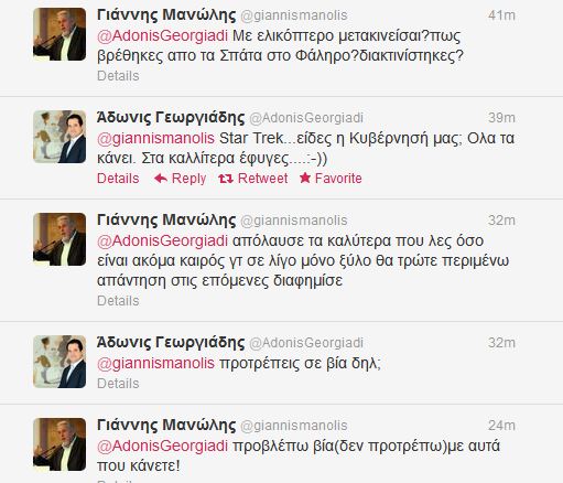 «Με ελικόπτερο μετακινείσαι? πως βρέθηκες από τα Σπάτα στο Φάληρο? διακτινίστηκες?», για να ακολουθήσει ένας καυστικός διάλογος: «Star Trek…είδες η Κυβέρνησή μας; Όλα τα κάνει. Στα καλλίτερα έφυγες….:-))», απάντησε ο κ. Γεωργιάδης.
