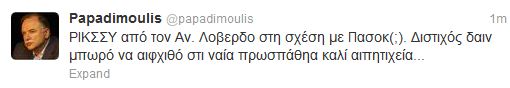 Καυστική ανάρτηση στο twitter για τον Ανδρέα Λοβέρδο, με εσκεμμένα ορθογραφικά λάθη, από τον Δημήτρη Παπαδημούλη. Οι “μπηχτές” του βουλευτή του ΣΥΡΙΖΑ οφείλονται σε ορθογραφικό λάθος του κ. Λοβέρδου, στην ανακοίνωση της διακήρυξης (σ.σ. διακύρηξη, γράφτηκε στο loverdos.gr) του κινήματος ΡΙ.Κ.Σ.ΣΥ.