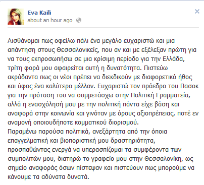 Η Εύα Καϊλή, είχε πρόταση, όπως η ίδια τονίζει, από τον πρόεδρο του ΠΑΣΟΚ, Ευάγγελο Βενιζέλο, να συμμετάσχει στην Πολιτική Γραμματεία του κόμματος. Γιατί όμως αρνήθηκε;Την απάντηση δίνει η ίδια, μέσω facebook.