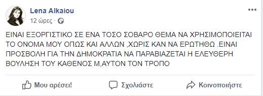 Από την πλευρά της, η τραγουδίστρια Λένα Αλκαίου, η οποία επίσης εμφανίζεται πως υπέγραψε το επίμαχο κείμενο, έγραψε στο προσωπικό της προφίλ στο Facebook : “Δηλώνω ότι ουδέποτε έβαλα την υπογραφή μου στο σχετικό έγγραφο. Δεν θέλω να εμπλακώ καθόλου στο συγκεκριμένο θέμα. Την στάση μου απέναντι στα πράγματα την ορίζω μέσα από το τραγούδι και τον πολιτισμό».