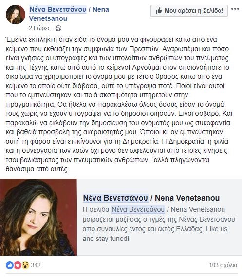 Συγκεκριμένα, η αρχή έγινε με τη γνωστή συνθέτρια και τραγουδίστρια Νένα Βενετσάνου, η οποία μέσω του προσωπικού της λογαριασμού στο facebook, δηλώνει έκπληκτη που είδε το όνομά της στο κείμενο, ενώ διερωτήθηκε για το κείμενο και την «πλαστή» υπογραφή της, λέγοντας: «Όποιοι κι αν εμπνεύστηκαν αυτή τη φάρσα είναι επικίνδυνοι για τη Δημοκρατία».