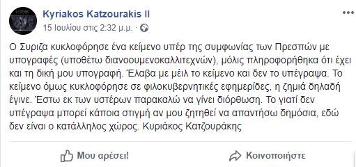 Ο ίδιος έγραψε στα social media «Ο Σύριζα κυκλοφόρησε ένα κείμενο υπέρ της συμφωνίας των Πρεσπών με υπογραφές (υποθέτω διανοουμενοκαλλιτεχνών), μόλις πληροφορήθηκα ότι έχει και τη δική μου υπογραφή. Έλαβα με μέιλ το κείμενο και δεν το υπέγραψα. Το κείμενο όμως κυκλοφόρησε σε φιλοκυβερνητικές εφημερίδες, η ζημιά δηλαδή έγινε. Έστω εκ των υστέρων παρακαλώ να γίνει διόρθωση. Το γιατί δεν υπέγραψα μπορεί κάποια στιγμή αν μου ζητηθεί να απαντήσω δημόσια, εδώ δεν είναι ο κατάλληλος χώρος».