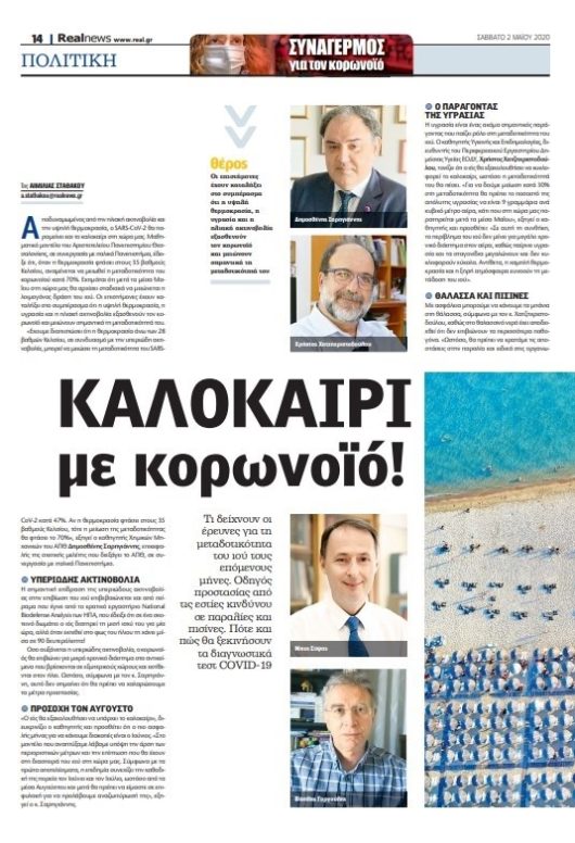 Αποδυναµωµένος από την ηλιακή ακτινοβολία και την υψηλή θερµοκρασία, ο SARS-CoV-2 θα παραµείνει και το καλοκαίρι στη χώρα µας. Μαθηµατικό µοντέλο του Αριστοτελείου Πανεπιστηµίου Θεσσαλονίκης, σε συνεργασία µε ιταλικά Πανεπιστήµια, έδειξε ότι, όταν η θερµοκρασία φτάσει στους 35 βαθµούς Κελσίου, αναµένεται να µειωθεί η µεταδοτικότητα του κορονοϊού κατά 70%. Εκτιµάται ότι µετά τα µέσα Μαΐου στη χώρα µας θα αρχίσει σταδιακά να µειώνεται η λοιµογόνος δράση του ιού. Οι επιστήµονες έχουν καταλήξει στο συµπέρασµα ότι η υψηλή θερµοκρασία, η υγρασία και η ηλιακή ακτινοβολία εξασθενούν τον κορονοϊό και µειώνουν σηµαντικά τη µεταδοτικότητά του.