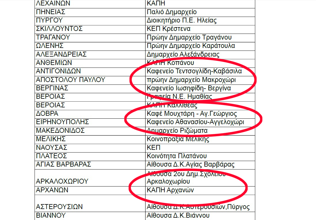 Καφενεία, αίθουσες (για πολλές χρήσεις), ΚΑΠΗ , δημαρχεία ακόμα και πρατήριο αλλά και κτίριο της κρατικής τηλεόρασης θα χρησιμοποιηθούν για τις εσωκομματικές εκλογές του ΠΑΣΟΚ. Οι λόγοι είναι πολλοί. Αρκετές από τις τοπικές επιτροπές έχουν “αδρανήσει”ενώ σε κάποιες περιοχές της Ελλάδας ,επέλεξαν κεντρικά κτίρια που οι ψηφοφόροι του ΠΑΣΟΚ θα έχουν εύκολη πρόσβαση. Θα δείτε 4 καφενεία, πολλά ΚΑΠΗ ,ξενοδοχεία, ακόμα και το “κτίριο ΕΤ3” στη Θεσσαλονίκη. Δείτε μερικά από τα εκλογικά κέντρα των επερχόμενων εσωκομματικών εκλογών του ΠΑΣΟΚ.