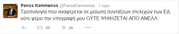 Την άποψη ότι δεν πρόκειται να ψηφίσει, την μείωση των συντάξεων στα στελέχη των Ενόπλων Δυνάμεων, εξέφρασε με ανάρτηση στον προσωπικό του λογαριασμό στο Twitter, ο υπουργός Εθνικής Άμυνας, Πάνος Καμμένος.