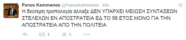 Με ένα tweet του ο υπουργός Εθνικής Άμυνας, Πάνος Καμμένος, έκανε γνωστό ότι η δεύτερη τροπολογία άλλαξε και δεν θα υπάρξει μείωση συντάξεων στα στελέχη των Ενόπλων Δυνάμεων.
