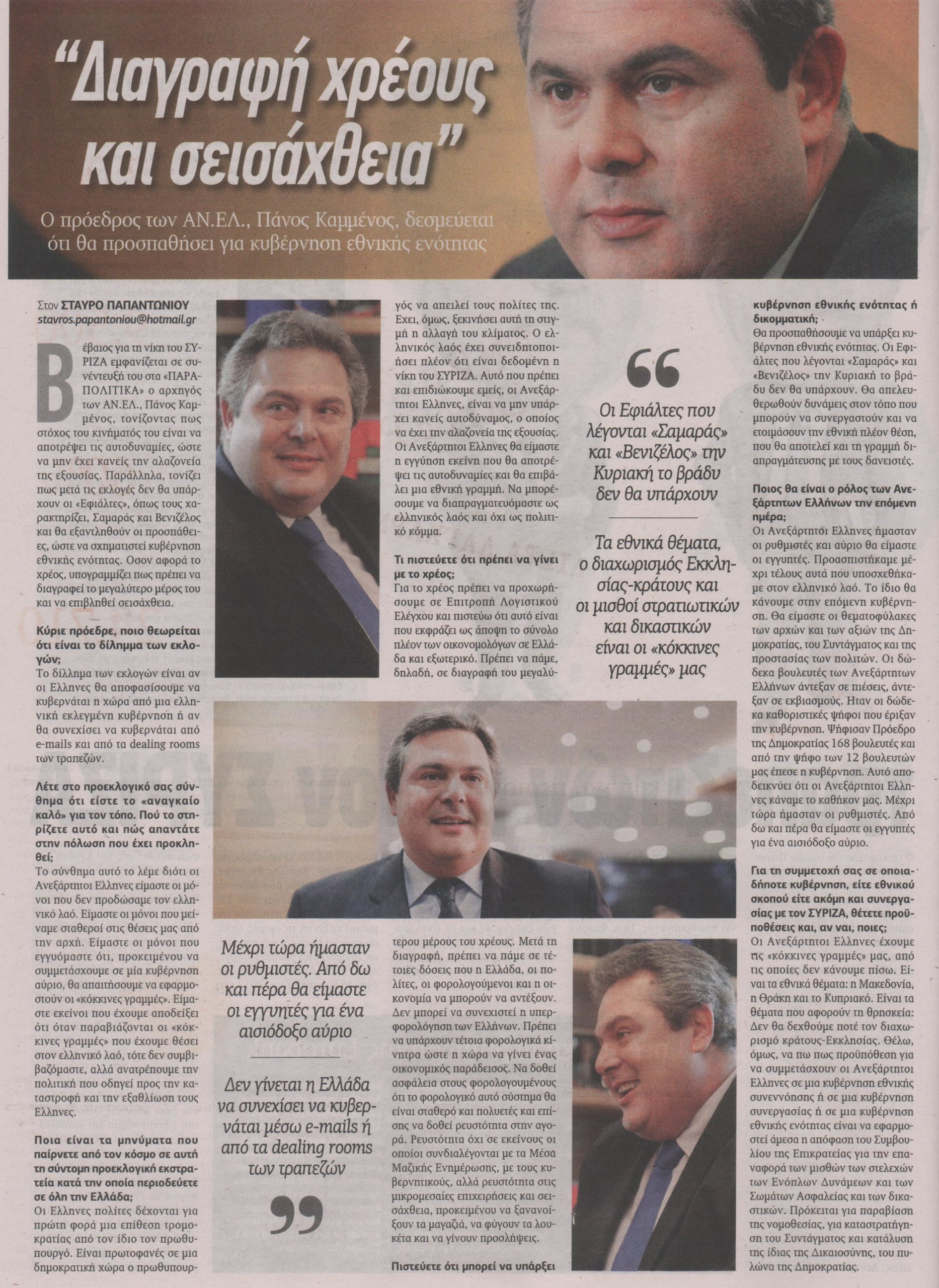 Πατήστε πάνω στη φωτογραφία και διαβάστε αναλυτικά τη συνέντευξη του Πάνου Καμμένου στην εφημερίδα «Παραπολιτικά»: