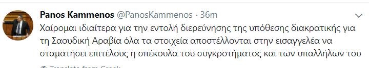 «Χαίρομαι ιδιαίτερα για την εντολή διερεύνησης της υπόθεσης διακρατικής για τη Σαουδική Αραβία. Όλα τα στοιχεία αποστέλλονται στην εισαγγελέα, να σταματήσει επιτέλους η σπέκουλα του συγκροτήματος και των υπαλλήλων του», αυτό αναφέρει σε ανάρτησή του στο twitter ο υπουργός Εθνικής Άμυνας Πάνος Καμμένος.