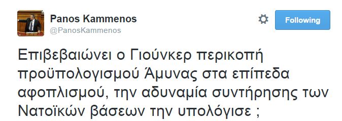 Ο υπουργός Εθνικής Άμυνας, Πάνος Καμμένος, σχολίασε με ένα tweet τα όσα είπε ο Πρόεδρος της Κομισιόν, Ζαν Κλοντ Γιούνκερ, για τις περικοπές στην Άμυνα.