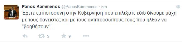 Συγκεκριμένα, ο κ. Καμμένος αναφέρει «έχετε εμπιστοσύνη στην Κυβέρνηση που επιλέξατε εδώ δίνουμε μάχη με τους δανειστές και με τους ανιπροσώπους τους που ήλθαν να ”βοηθήσουν”…