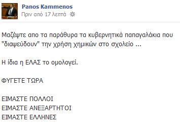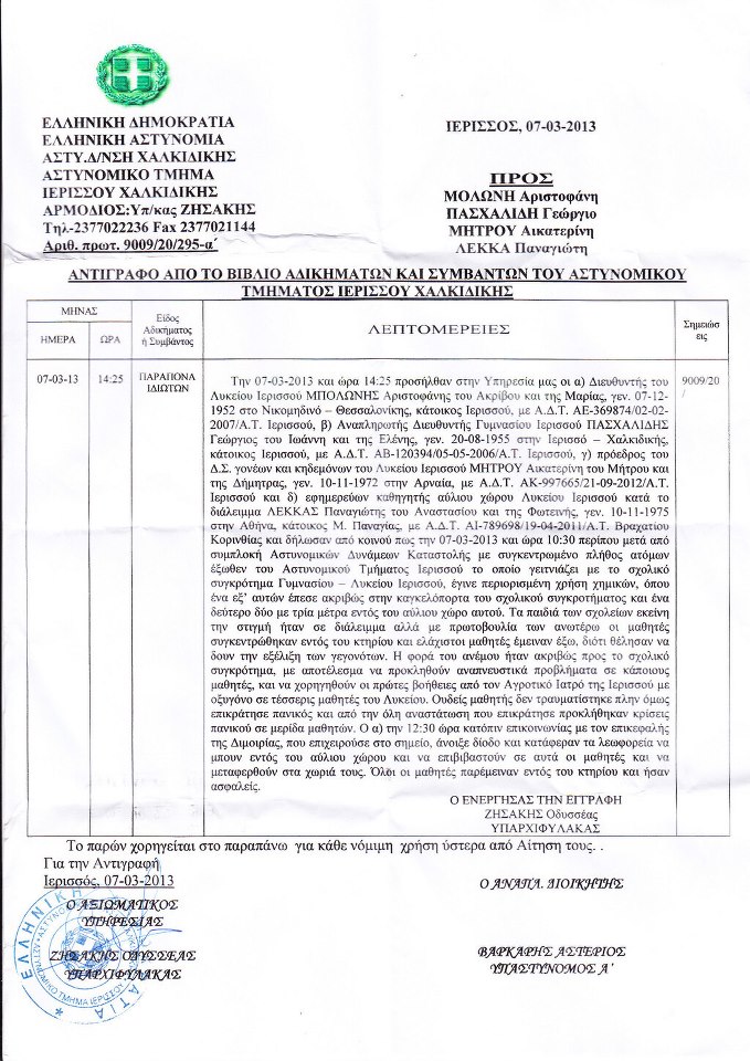 Πριν από λίγο ο Πάνος Καμμένος ανήρτησε στην προσωπική του σελίδα στο Facebook ένα αντίγραφο από το βιβλίο αδικημάτων και συμβάντων του Αστυνομικού Τμήματος Ιερισσού με το ακόλουθο σχόλιο: “Μαζέψτε απο τα παράθυρα τα κυβερνητικά παπαγαλάκια που “διαψεύδουν” την χρήση χημικών στο σχολείο …