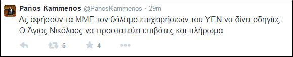 Με ένα μήνυμα στον προσωπικό του λογαριασμό στο twitter o Πρόεδρος των Ανεξάρτητων Ελλήνων, Πάνος Καμμένος, ευχήθηκε για την ευτυχή κατάληξη της επιχείρησης διάσωσης των επιβατών του πλοίου Norman Atlantic.