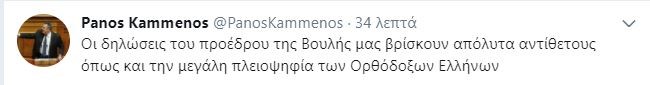 Σε ανάρτηση στον λογαριασμό του στο twitter o υπουργός Εθνικής Άμυνας και πρόεδρος των Ανεξαρτήτων Ελλήνων Πάνος Καμμένος τονίζει: “Οι δηλώσεις του προέδρου της Βουλής μας βρίσκουν απόλυτα αντίθετους όπως και την μεγάλη πλειοψηφία των Ορθόδοξων Ελλήνων”.