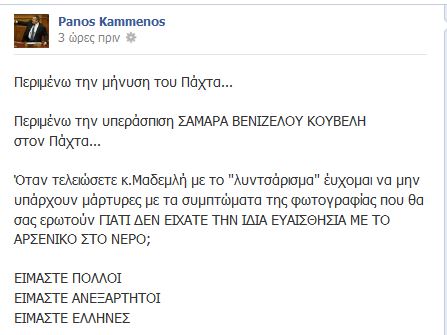 Την μήνυση του Χρήστου Πάχτα δήλωσε ότι περιμένει ο Πάνος Καμμένος στη σελίδα του στο Facebook.